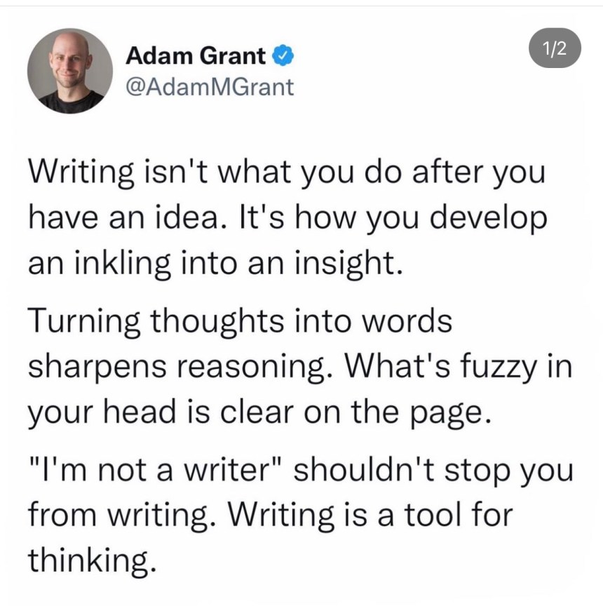 The Adam Grant quote, ‘writing is a tool for thinking’ often pops into my mind. Mostly, the quote resonates because it is true (for me). At times I feel defeated when I consider the time I put into creating content and the observable/measurable results. And then I whiddle it back to my why : the creative process helps me understand big ideas in a way that is meaningful and transferable.