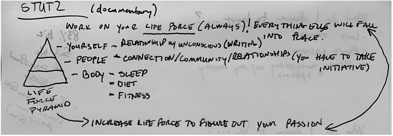I brought up the morning movement because one of the first things Stutz references is what he calls the Life Force. He draws a pyramid with three horizontal lines. He says that one must get in touch with their Life Force when they desire different outcomes. On the bottom is the Physical. This is food, movement, sleep and rest. He says when he first begins with a client who presents with depression, 85% of moving toward different outcomes begins with getting into the physical and developing a relationship with your body: give the big energy an action.
