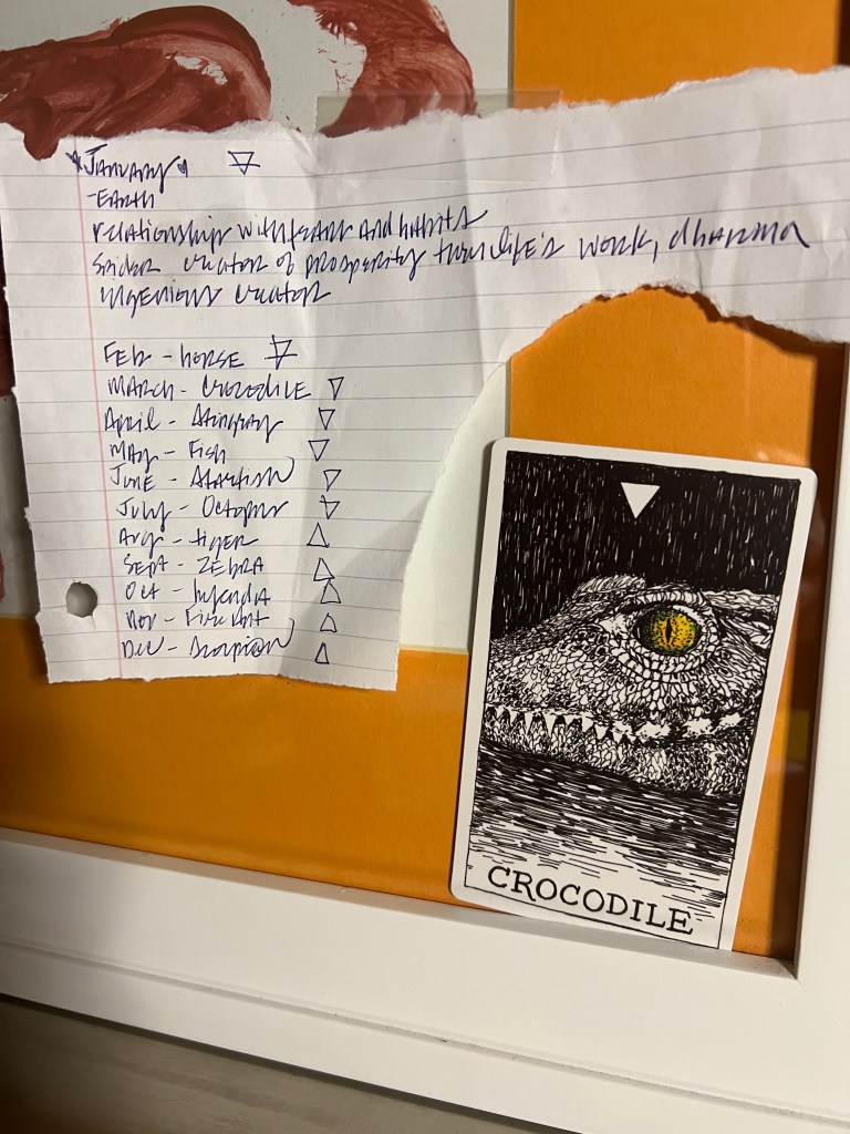 Because I didn’t blog last weekend, I neglected to share the animal spirit theme for the month: crocodile. For me, the main takeaway, or ‘power’ in this card can be whittled to one word: wait.
