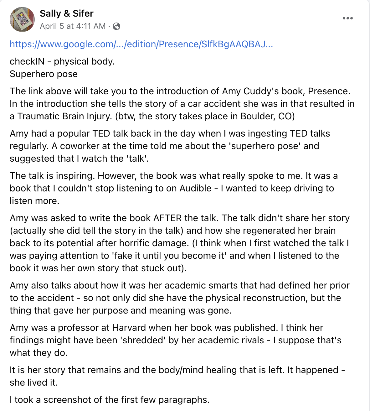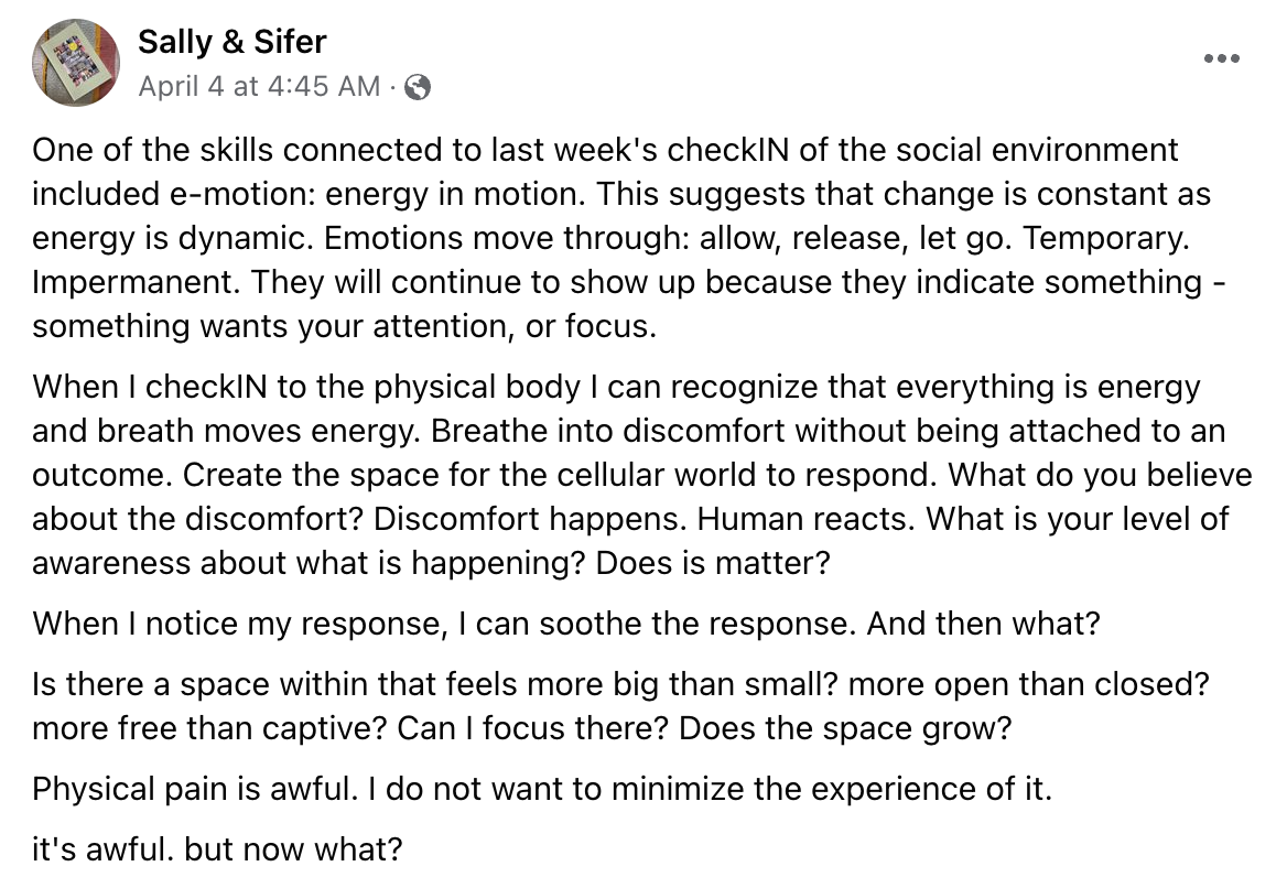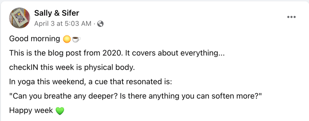 The following are @sallysifer Facebook posts from the third week of an 8-week checkIN series: physical environment.