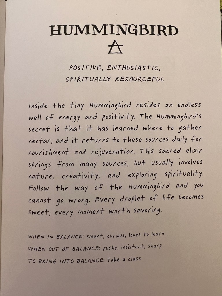 What’s a girl with an animal spirit guidebook going to do but look up hummingbird as soon as she gets home.