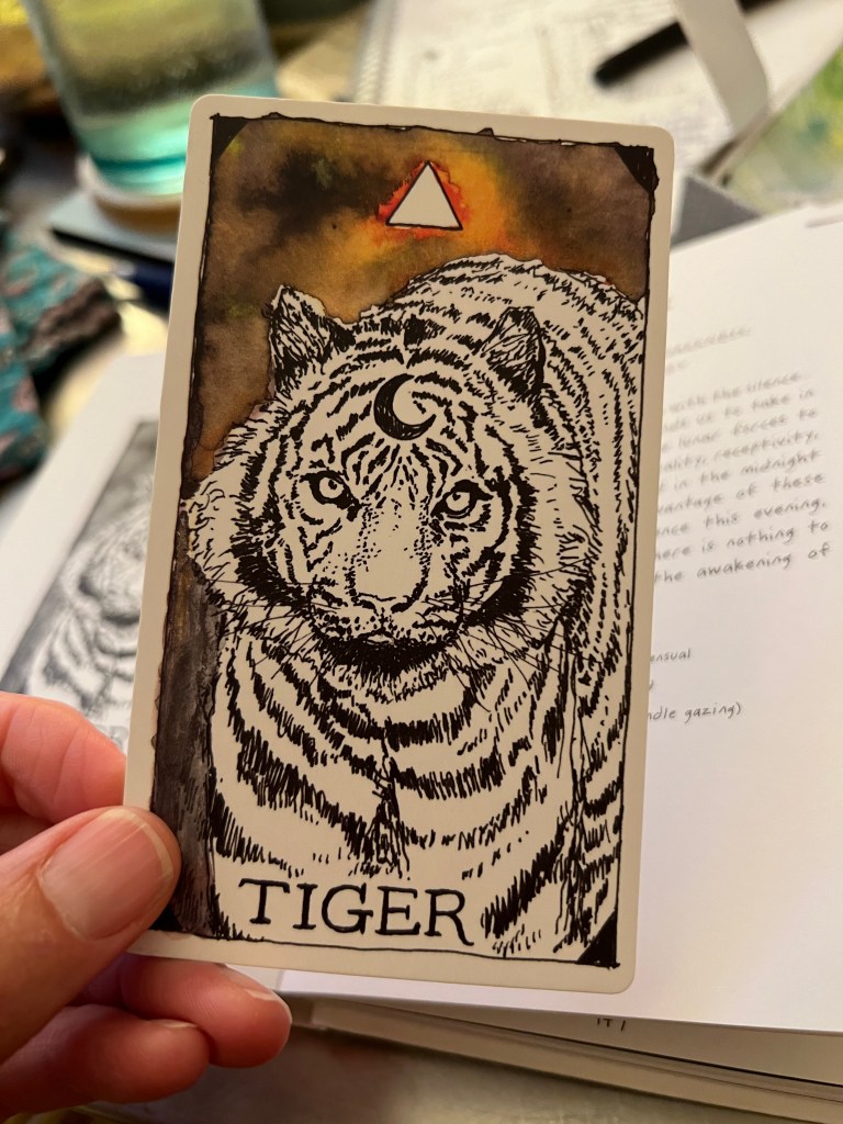 Tiger is badass and also the first of the final five Fire cards. It’s interesting (to me) that the first two cards were Earth – grounding, for January and February. The next five were Water, and now Fire. If you notice your own patterns, you may pick up on how a calendar year plays out – a grind to begin the new year, working toward a crescendo in June – July, and then some ease up through the holidays. We are not all alike – obviously. I like to share from my own experience and general observation of what can feel uplifting, encouraging….and playfully mystical: can we add enchanting and bejeweled from my summertime singaglong?