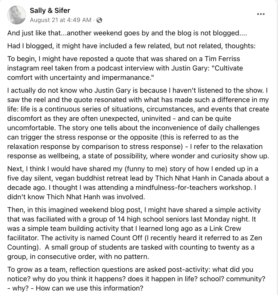 I was doing a sweep of screenshots on my desktop and found this simple strategy. In the lens of self-care, it’s the same thing with the exception of inserting ‘yourself’ for the ‘a child’ and so forth, and the word ‘learn/practice’ instead of ‘teach’ at the bottom.