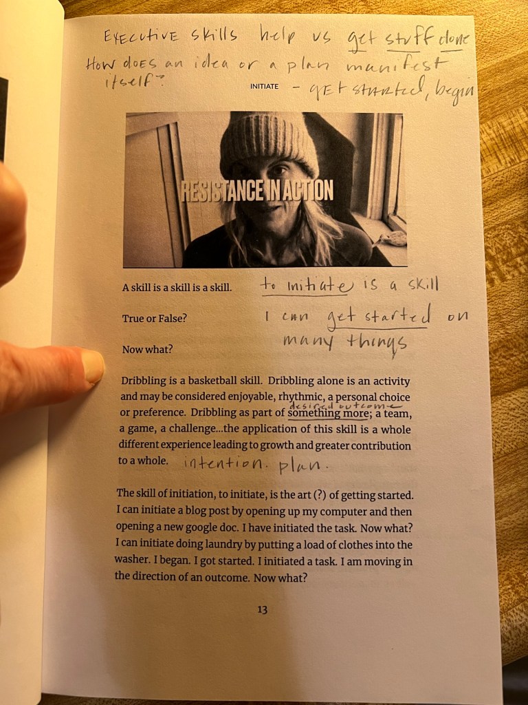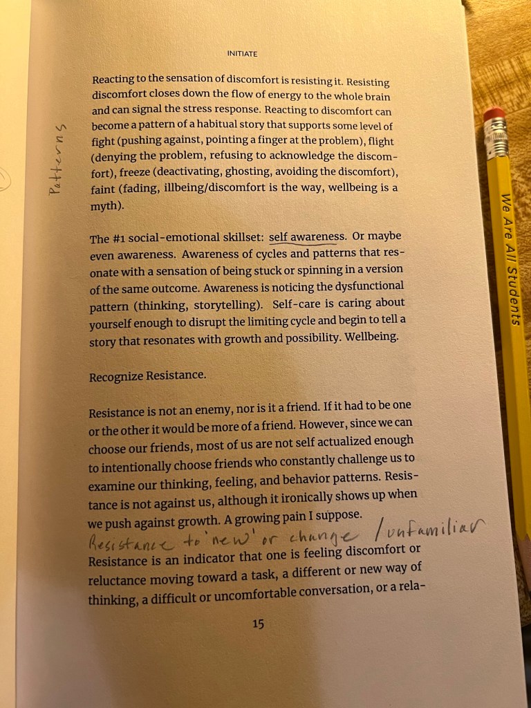 - Are you open to connecting the skill of awareness, or ‘the noticer,’ as what observes one’s response to the situation, circumstance, event that presents as new information? For now, just notice the inner resource of awareness is what observes resistance. Resistance can be helpful. Unobserved resistance is what keeps one from initiating, or moving toward discomfort to problem solve. Are you open to noticing and naming resistance as a skill to practice?