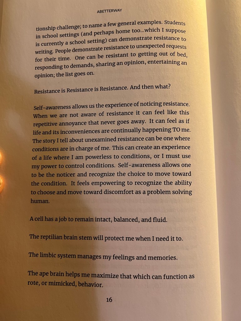 Resistance exists. Resistance is important. Identifying the felt experience of resistance in one’s body in response to discomfort (ie. change) is a skill that levels up day and makes one feel empowered as to how they want to show up and express themselves.