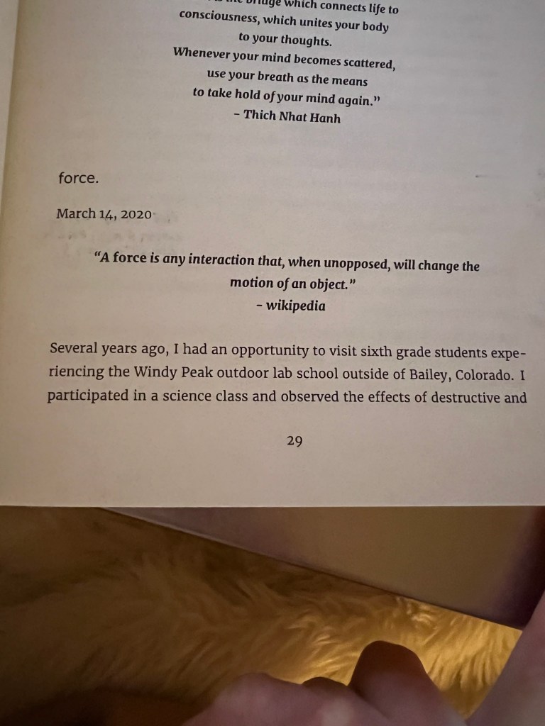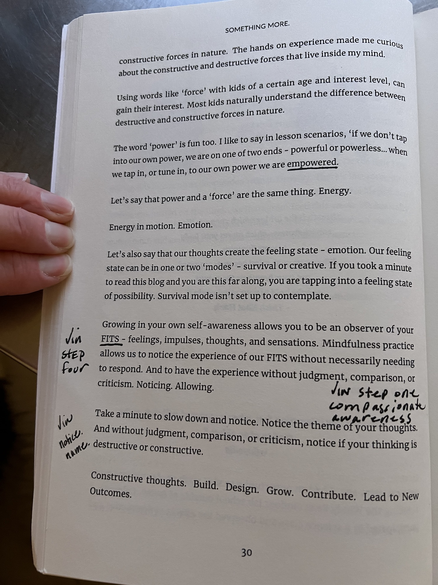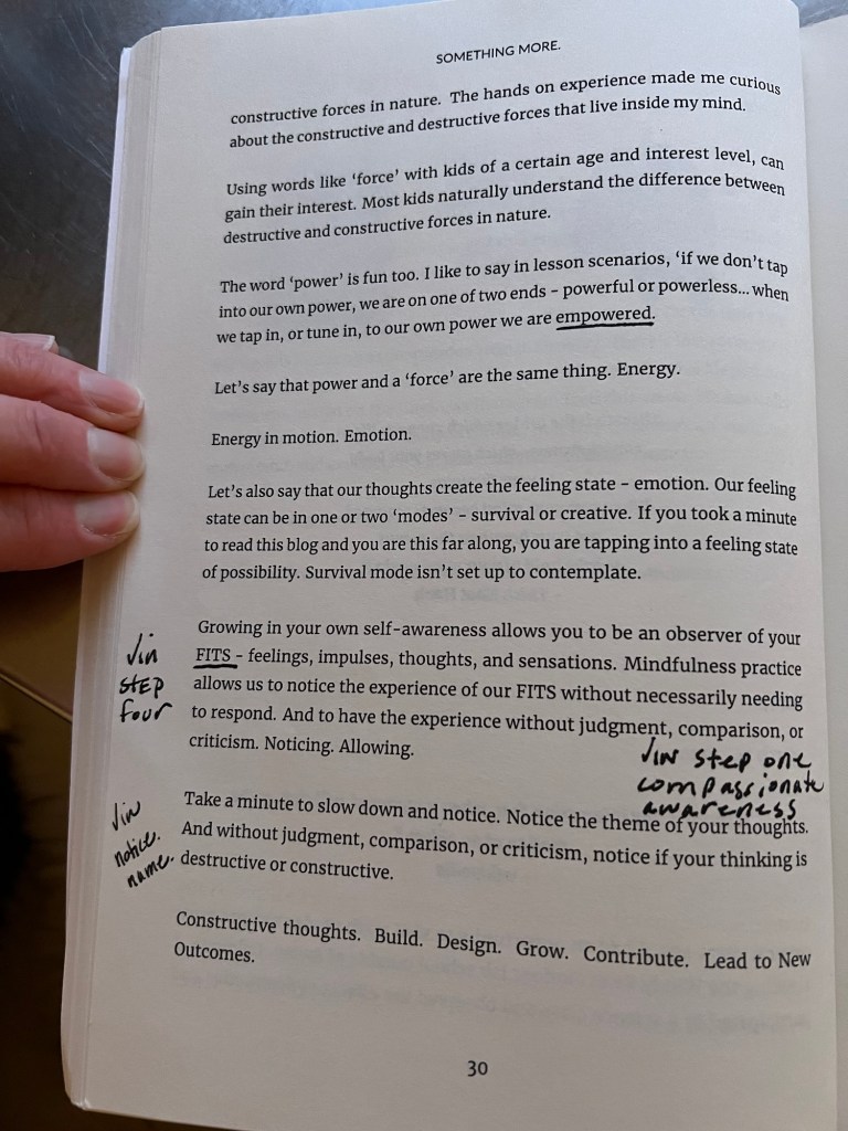 - Do you wonder about the situations, circumstances, events that happen in your life? Are they pieces of you? I wonder about this. It’s easy to assume what happens is happening to you. Consider your thoughts on this in comparison to the part in the excerpt that speaks of powerless and powerful. Can you change your thoughts to be empowering? Why would you do so? Where would you practice this? (ie. Quiet Time)