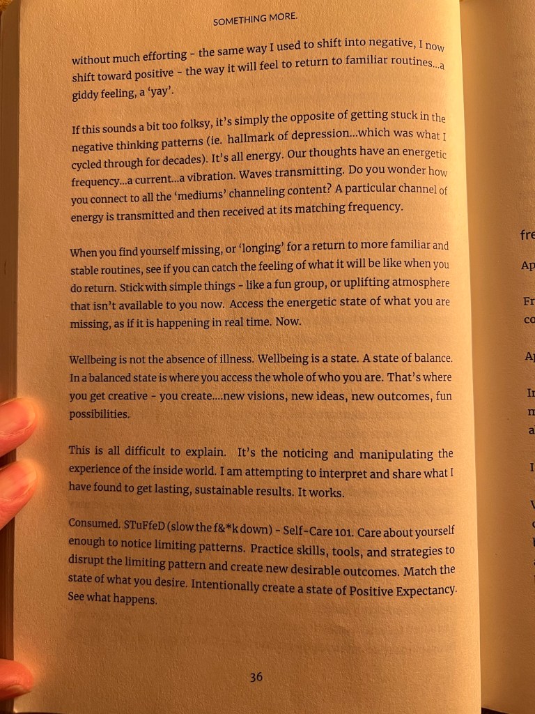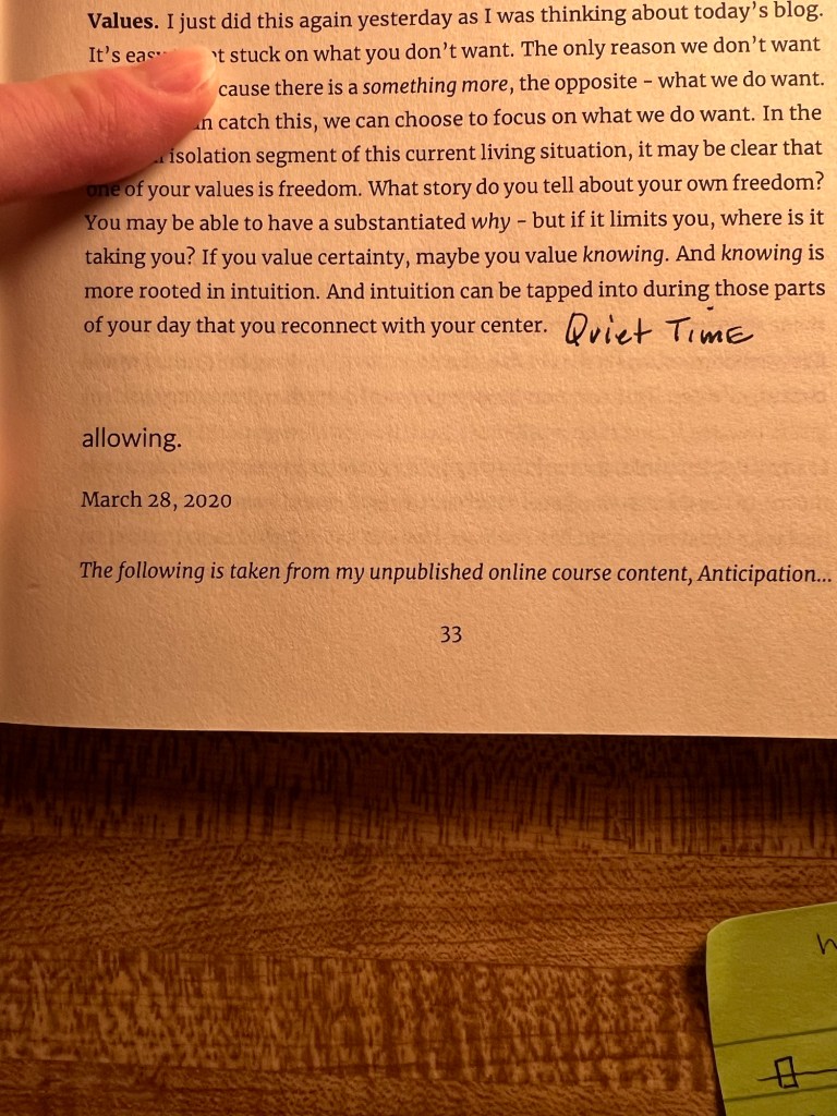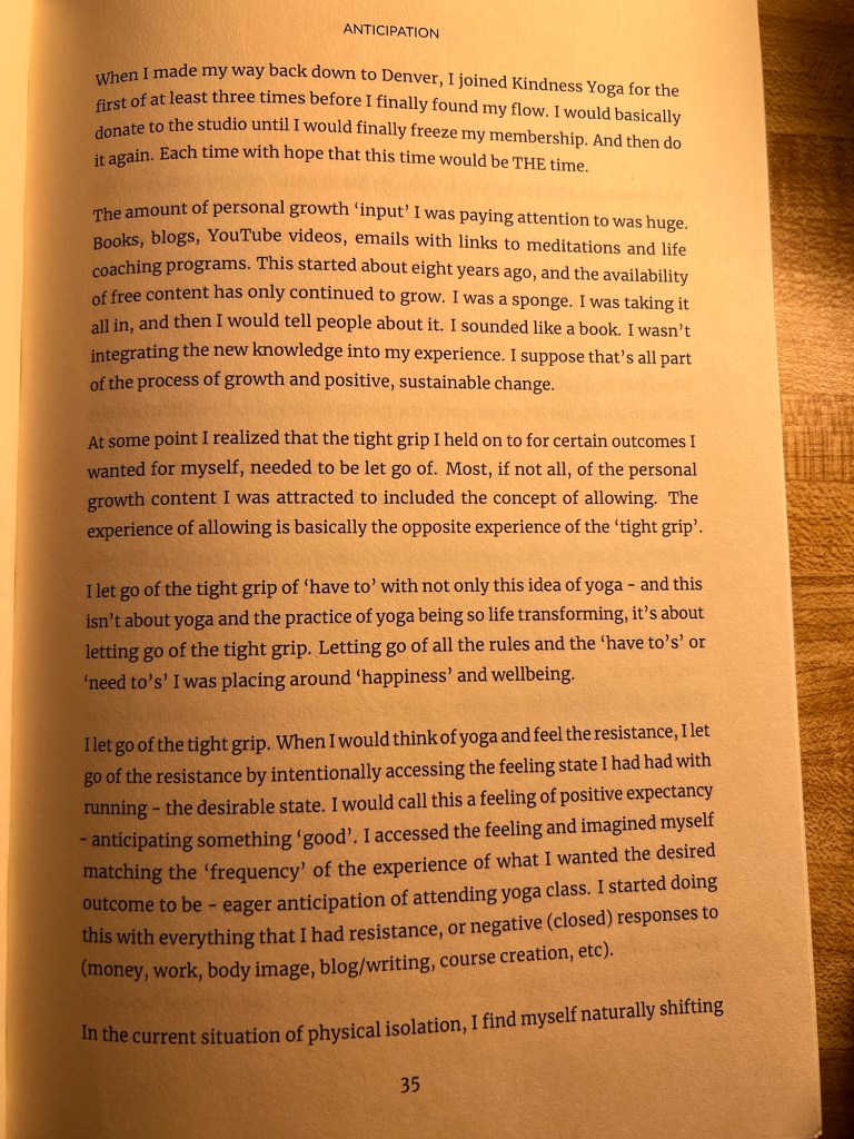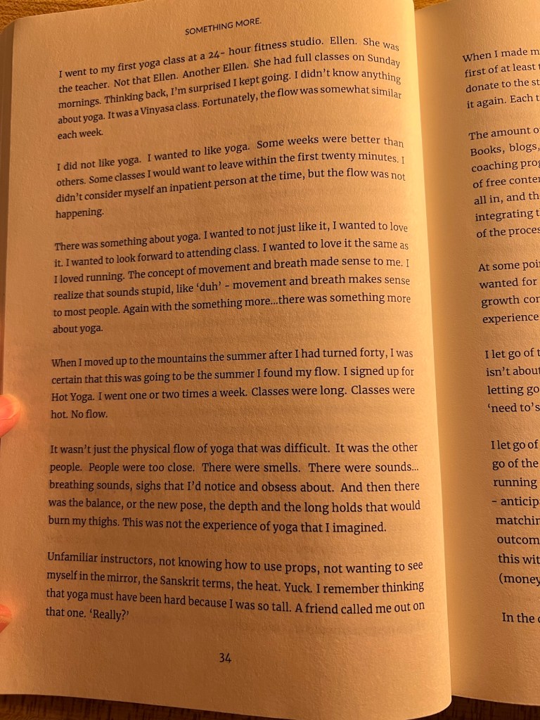 I suppose if I were facilitating a live book club, for today’s excerpt I’d start by noticing the feeling state of a desired outcome. In the excerpt, I had a feeling state that I desired – it was connected to the experience of running. When I wrote this post in 2020, I hadn’t run in years. I also assumed I wouldn’t run again (knees), and had made peace with it. Rather than longing for a time when I could run for miles (I refer to running as my original Quiet Time), I captured the feeling that running gave me. An eagerness. There was an obsession/addiction thing going on as well, but that’s not today’s focus.