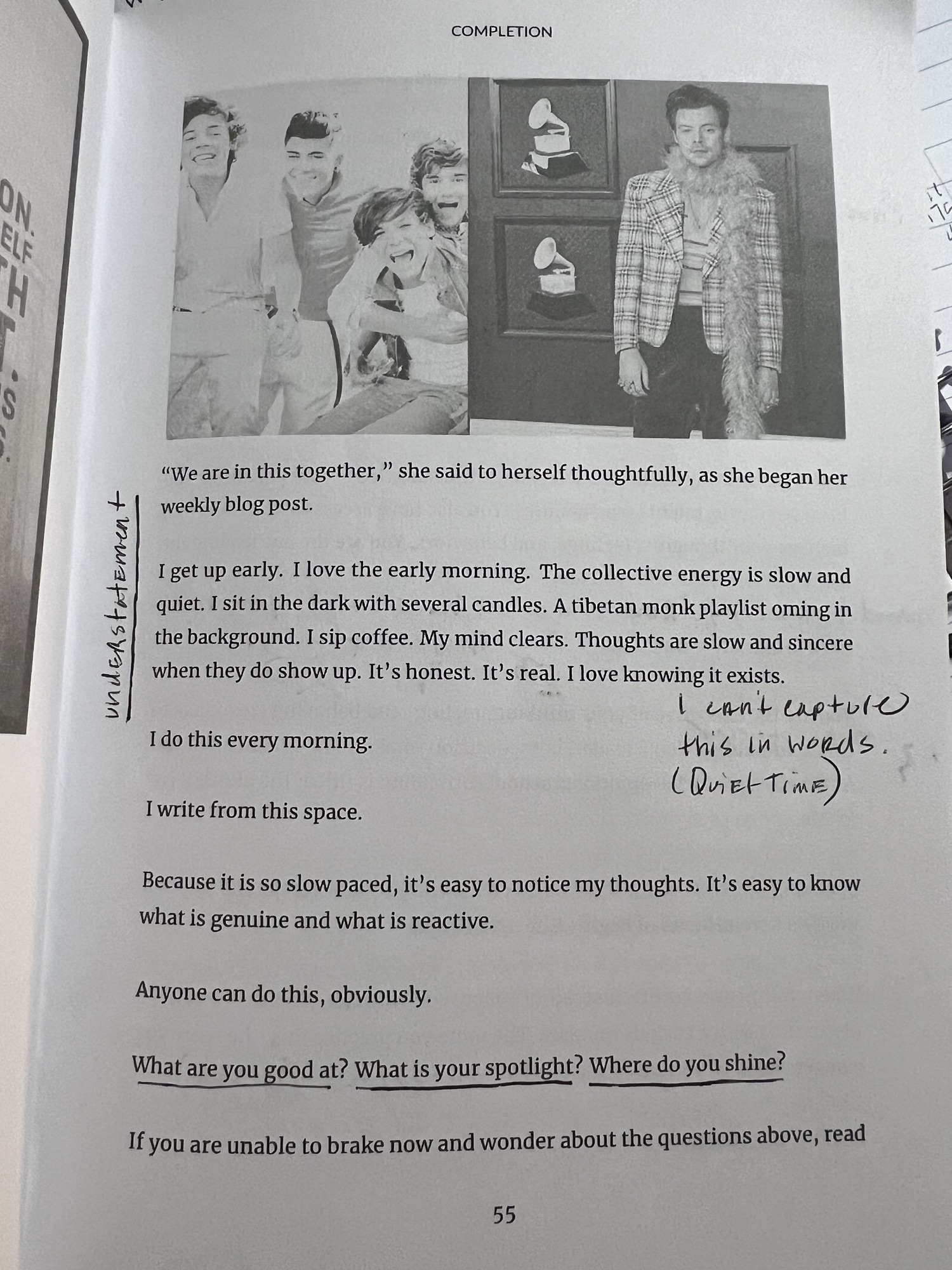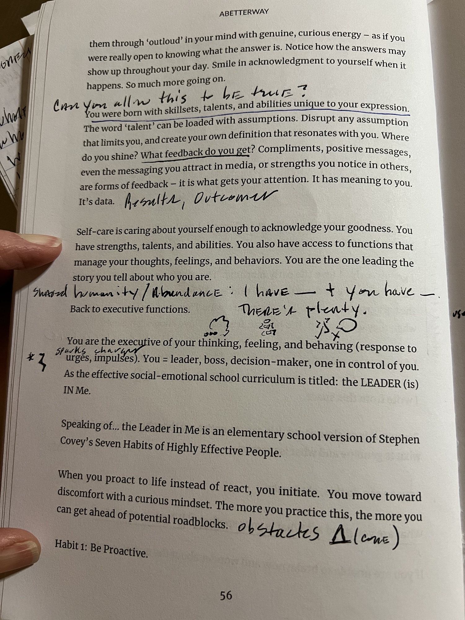 Ask: What do I notice, or What am I noticing, or I’m noticing… In the self care (caring about self) realm, this can be noticing how the nervous system is experiencing time and space. Mind. Heart. Belly. Muscles. Skin. See tips. (from storyitell pt III) for noticing resistance. Speaking of the storyitell realm, one can also notice their own data: what results are showing up? It is my opinion, that when one cares about themself, they notice incremental growth. Growth can be attributed to level of intensity, duration, and frequency. In the case of helpful habits, one might want to increase these areas of growth; and in the case of unhelpful habits, decrease. The ‘opps’ are at play here. And my use of opps is short for opportunities, just like reps for repetitions. Any new skill needs opps or reps to increase frequency and begin to normalize or transmute the less helpful habit. And of course, there will be the next thing to build and grow in the same way. The pattern and opportunities for growth won’t change, but the way we think about growth as a constant supports a mindset that helps one move toward the discomfort with a desired outcome in mind.