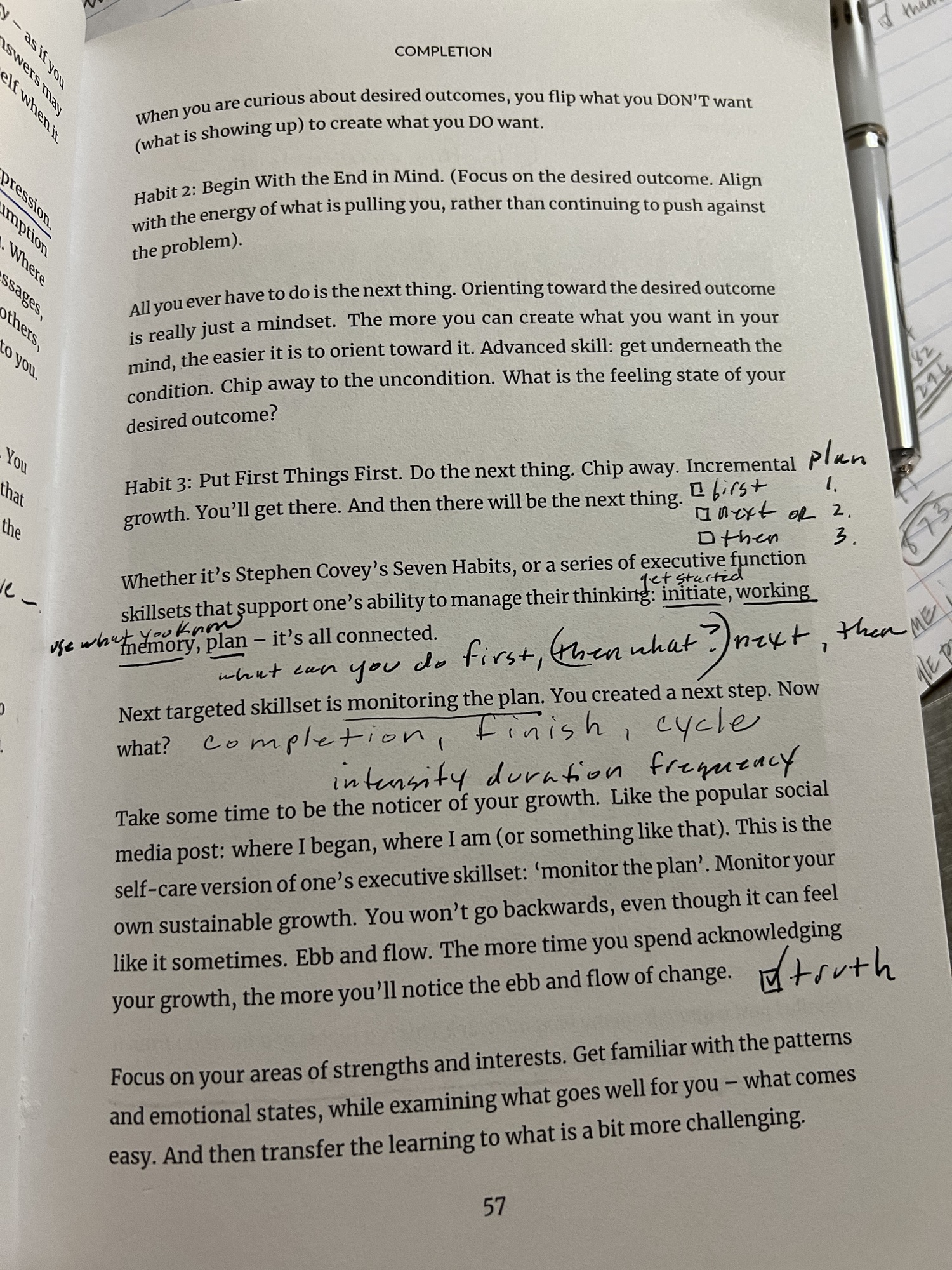 Plan: One may not know all the steps, but one can do the next thing. Depending on what was noticed, and what the desired outcome is, are there next steps one can focus on to move one’s energy in the direction of what’s possible?