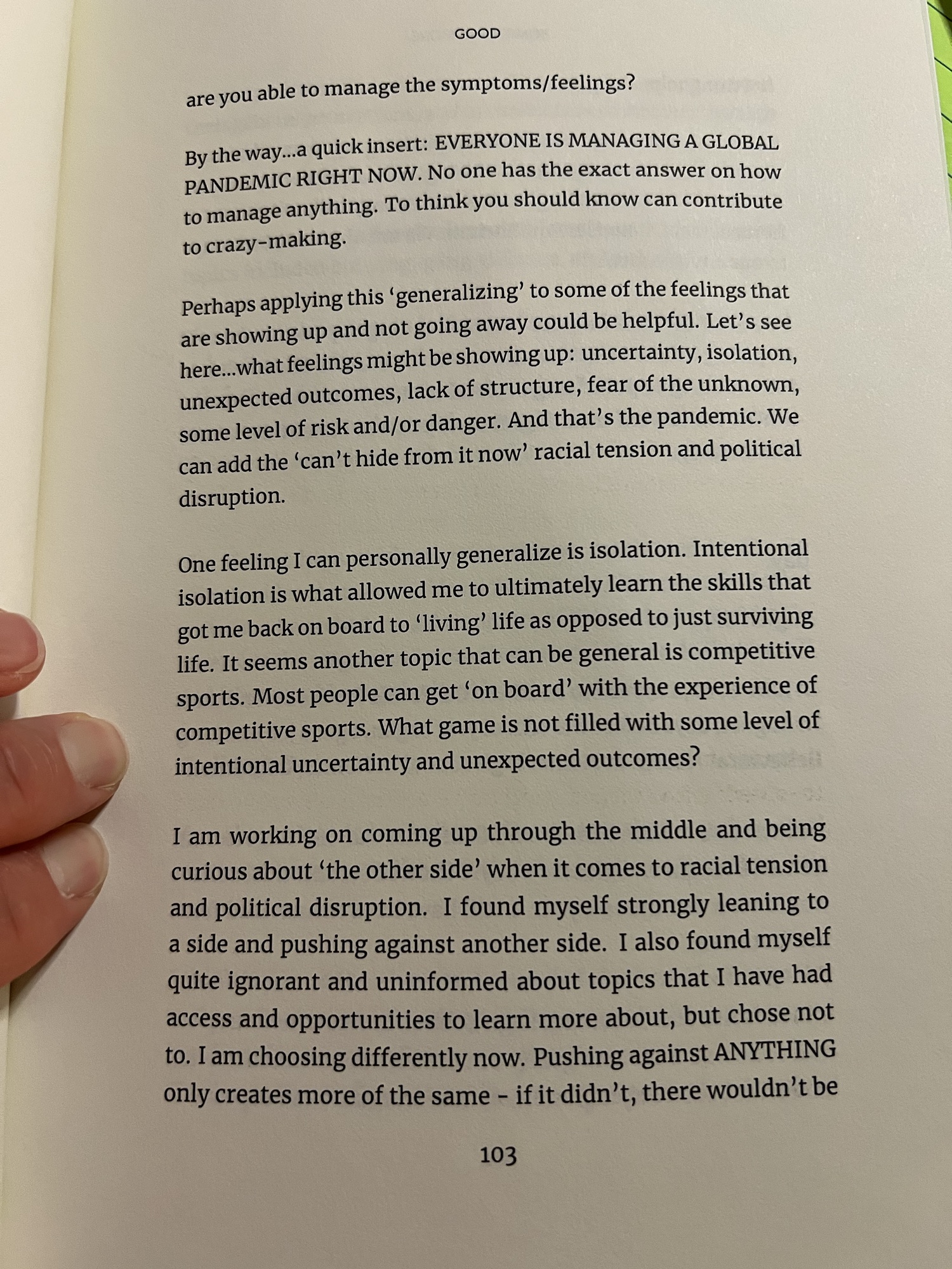 I was also thinking of Phil Stutz. (reference Stutz documentary on Netflix, also author of several books). Phil Stutz is a psychiatrist who recognizes his patients need tools to manage the discomfort of what they are experiencing. One thinking tool Phil offers is for one to accept that to live is to know and accept there will be pain, uncertainty, and constant work.
