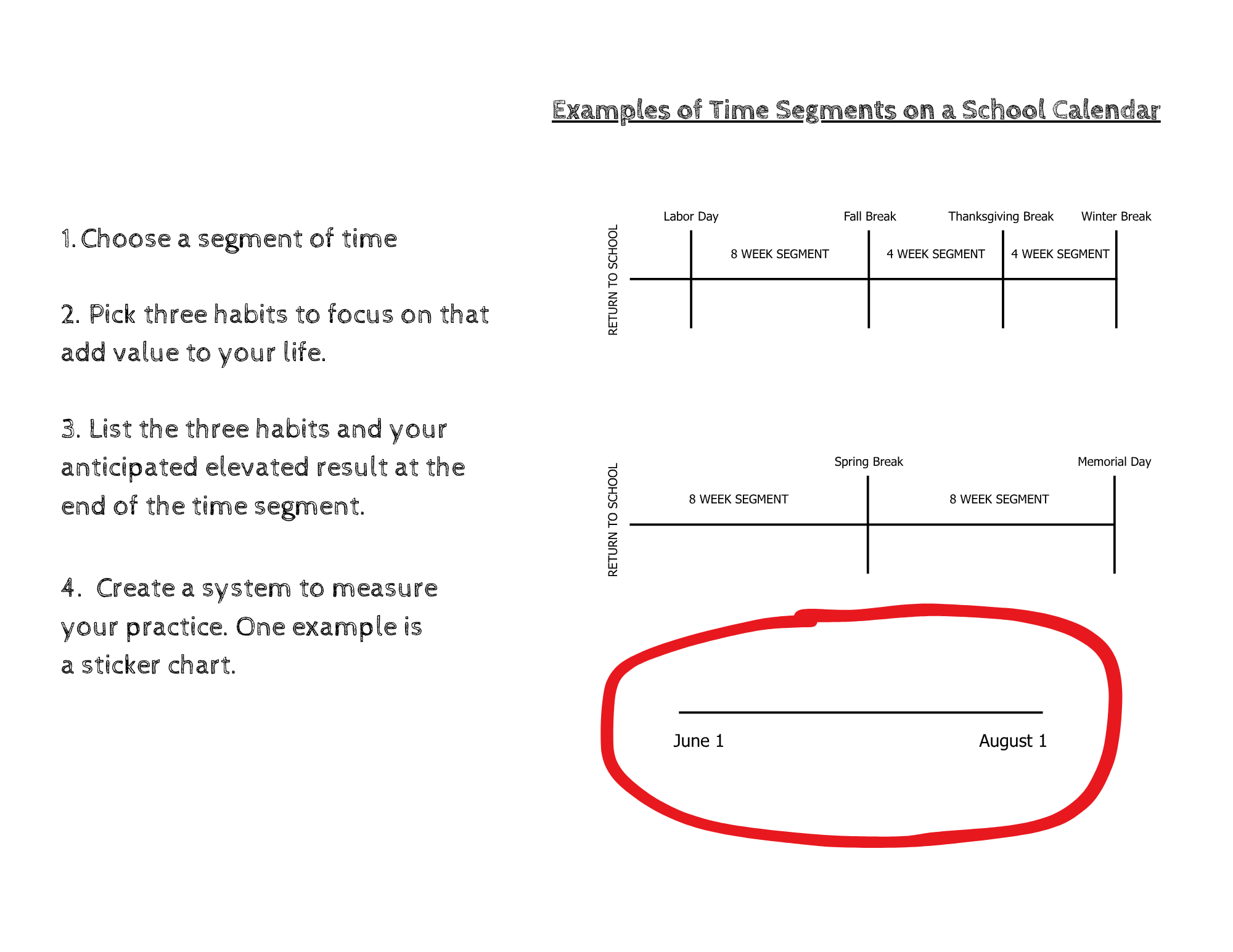 I am beginning my summer segment on June 4. I wrote a post dated journal entry (using my workbook as a reset when school ended) dated August 4. The three habits I chose to focus on and reinforce are based on suggestions I received from our school Wellness Coach. I’m focusing on areas of wellness that I typically stay away from: financial and organization (digital specifically). My third habit is based on my personal Yoga practice. Example: For four days a week over eight weeks – 20 minutes of reading/watching/listening to a financial resource, 20 minutes organizing my google drive, and 20 minutes practicing Yoga alone ‘organically’. I keep a notebook and I love stickers on a visual calendar.