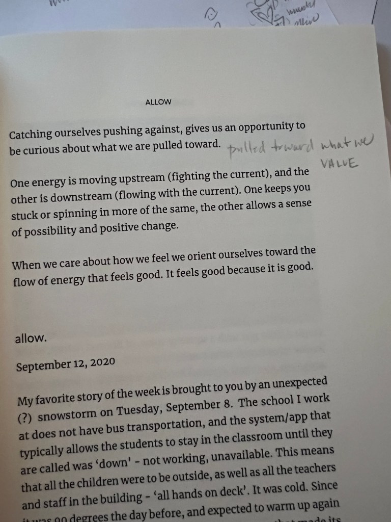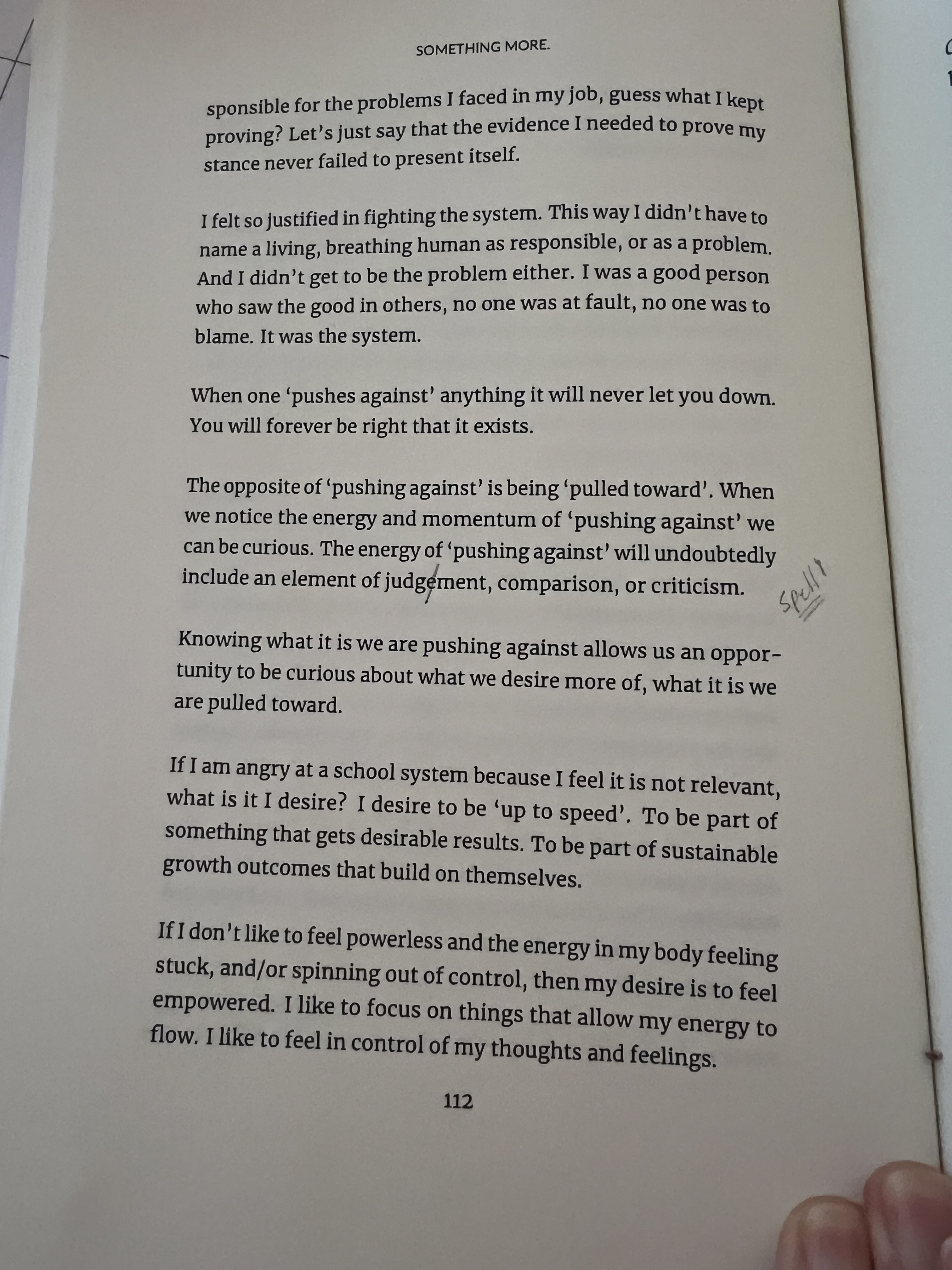 - Can you experience the different energy of what I am referring to as ‘pushing against’, as compared to the energy of being ‘pulled toward’? is it helpful to notice? what feels better? can orientating to what one is pulled toward feel more aligned to one’s personal experience of meaning and purpose? (or living aligned with one’s values?)